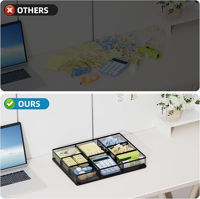 - Sturdy and Durable: Made of strong wire mesh with a powder-coated finish that is smooth, corrosion-resistant, and built to last. Non-slip feet keep the organizer stable and in place.This practical desk drawer organizer also makes a perfect gift for your family and friends.