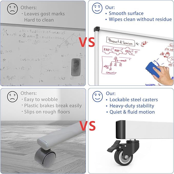 - Easy to Move, Stable When Locked: The whiteboard on wheels includes four 360° steel casters that glide quietly on all floor types. Each wheel locks in place for a secure writing experience. Move your board freely, then keep it steady where needed.
