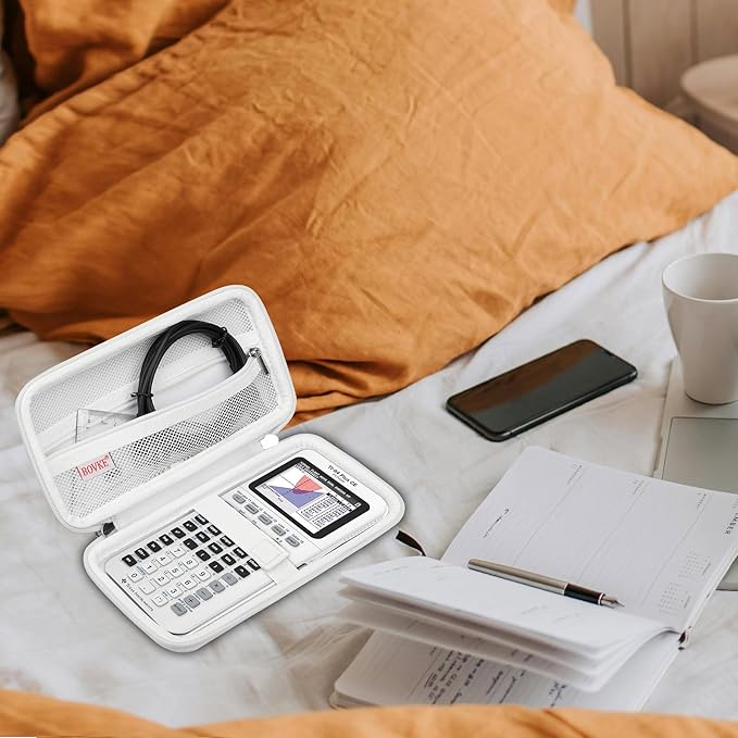 BOVKE Hard Travel Case for Texas Instruments TI-84 Plus CE/TI-84 Plus/TI-83 Plus CE/TI-83 Plus/Casio fx-9750GIII Graphing Calculator, Mesh Pocket for USB Cables, Manual, Pens, Accessories, White