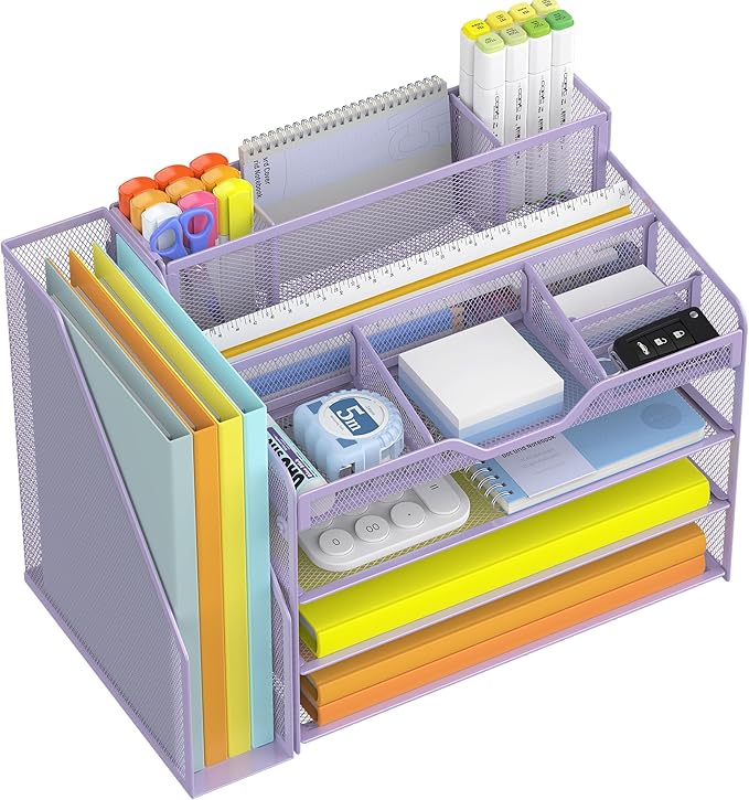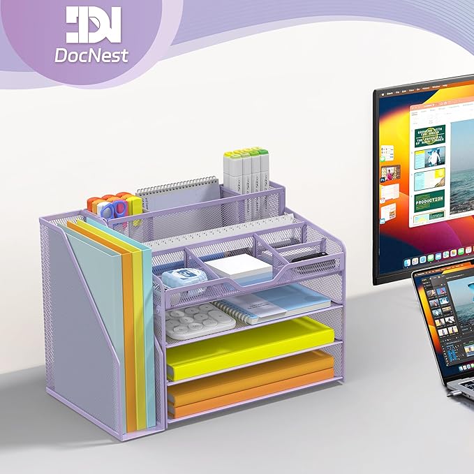Docnest 4 Tier Mesh Desk Organizer with File Holder – Multi-Functional Paper Letter Tray with 5 Adjustable Compartments, 3 Pen Holders, Desktop Storage for Files, Mail, Stationery – Purple