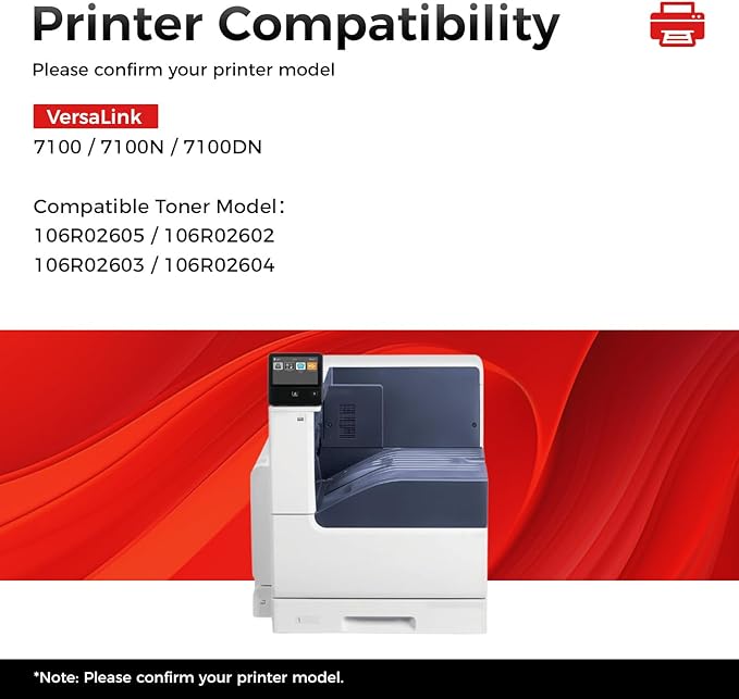 - Compatible Devices : Compatible for Xerox Phaser 7100,7100N,7100DN, Compatible Toner Model: 106R02605,106R02602, 106R02603,106R02604 Compatible for Xerox Phaser 7100,7100N,7100DN, Compatible Toner Model: 106R02605,106R02602, 106R02603,106R02604