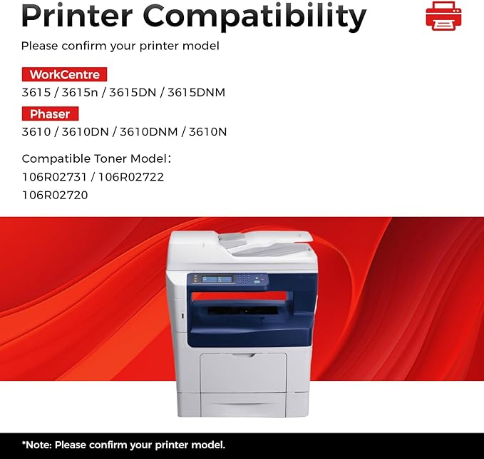 - Compatible Devices : Compatible for Xerox WorkCentre 3615,3615n,3615DN,3615DNM, Phaser 3610,3610DN,3610DNM,3610N; Compatible Toner Model:106R02731,106R02722, 106R02720 Compatible for Xerox WorkCentre 3615,3615n,3615DN,3615DNM, Phaser 3610,3610DN,3610DNM,3610N; Compatible Toner Model:106R02731,106R02722, 106R02720