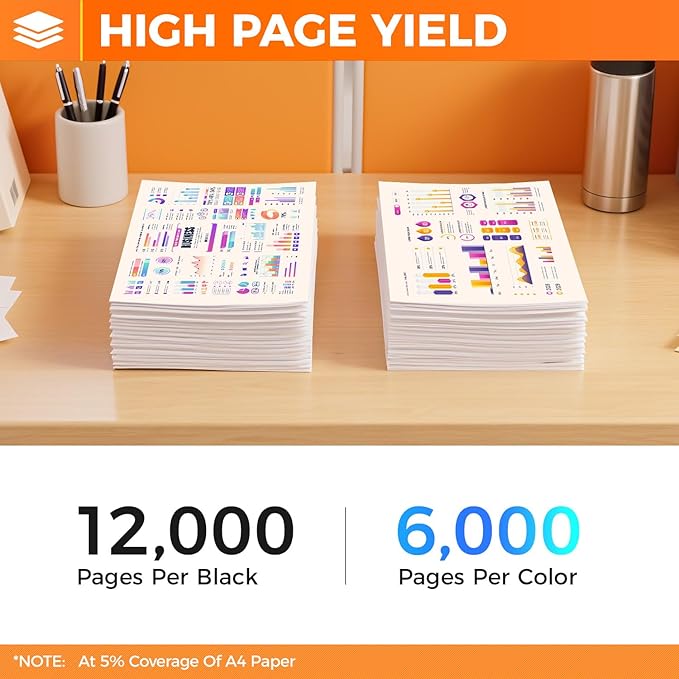 - Page Yield: up to 12,000 pages per black toner, up to 6,000 pages per color toner, @5% coverage at A4 size paper