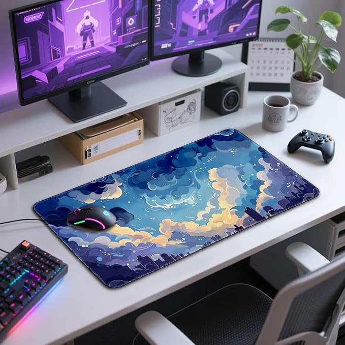- STUNNING DESIGN: Features a dreamy cityscape silhouette against dramatic blue and golden clouds, creating an artistic and atmospheric desk aesthetic. This gaming mouse pad adds a touch of fun to your workspace