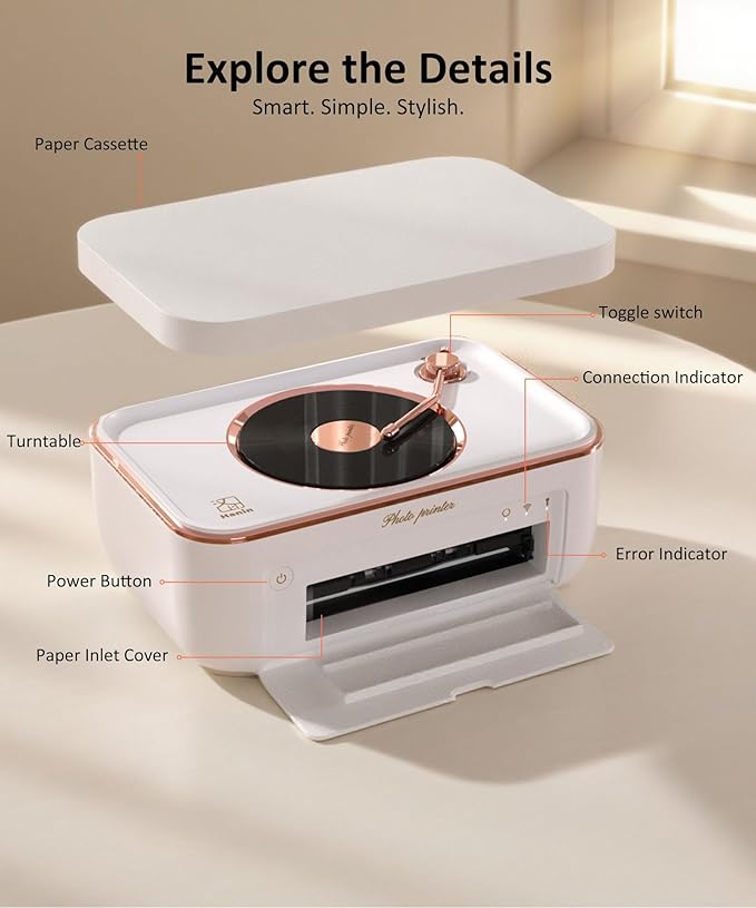 - ✅【Unique Turntable-Inspired Bluetooth Photo Printer】 This wireless photo printer is designed with a retro vinyl look and a tonearm-style lever. Connect via Bluetooth to use it as a compact speaker, play voice messages, or print photos—all in one device that combines fun and function.