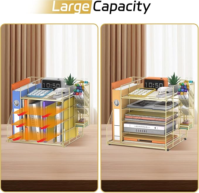 - 【Humanized Design】The desk organizer adopts an ergonomic layout design, which makes it easy to access files on the desk, making item retrieval more efficient. Trays of the desk file organizer can be adjusted, and the tray can be slid out to obtain a larger single-layer space.