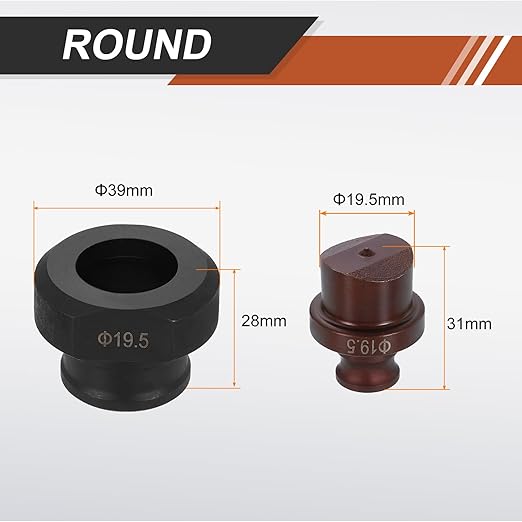 - Size - Hole Punch Die Shape: Round; Upper hole dia: Φ19.5mm; Hardness: HRC56-58; Upper die height: 31mm; Lower die height: 28mm; Lower die diameter: 39mm.