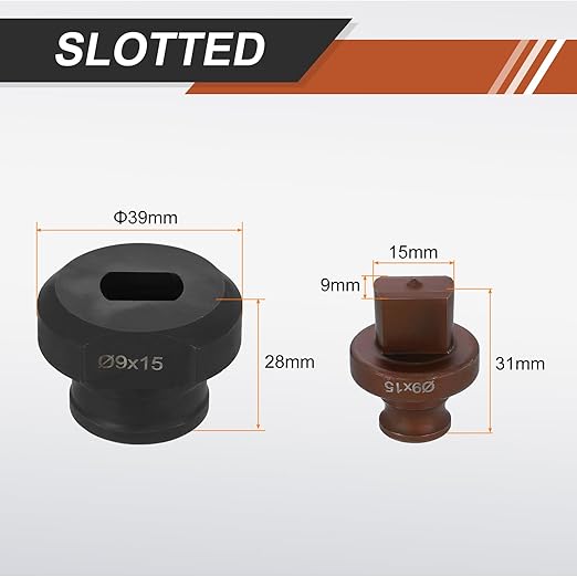 - Size - Hole Punch Die Shape: Slotted; Upper hole dia: Φ9x15mm; Hardness: HRC56-58; Upper die height: 31mm; Lower die height: 28mm; Lower die diameter: 39mm.