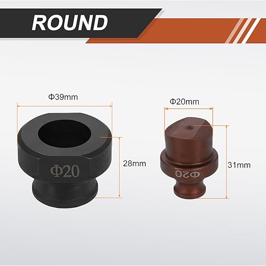 - Size - Hole Punch Die Shape: Round; Upper hole dia: Φ20mm; Hardness: HRC56-58; Upper die height: 31mm; Lower die height: 28mm; Lower die diameter: 39mm.