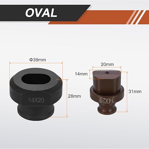 - Size - Hole Punch Die Shape: Oval; Upper hole dia: Φ14x20mm; Hardness: HRC56-58; Upper die height: 31mm; Lower die height: 28mm; Lower die diameter: 39mm.