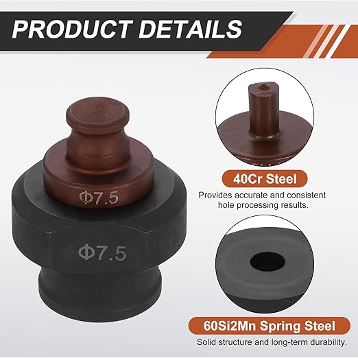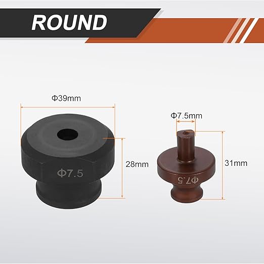 - Size - Hole Punch Die Shape: Round; Upper hole dia: Φ7.5mm; Hardness: HRC56-58; Upper die height: 31mm; Lower die height: 28mm; Lower die diameter: 39mm.