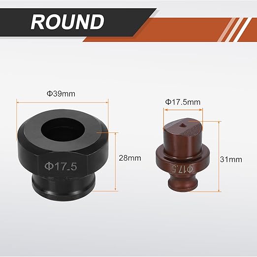 - Size - Hole Punch Die Shape: Round; Upper hole dia: Φ17.5mm; Hardness: HRC56-58; Upper die height: 31mm; Lower die height: 28mm; Lower die diameter: 39mm.