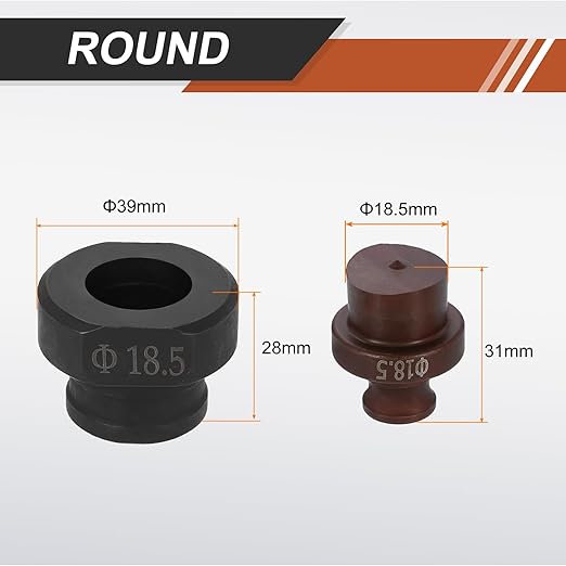 - Size - Hole Punch Die Shape: Round; Upper hole dia: Φ18.5mm; Hardness: HRC56-58; Upper die height: 31mm; Lower die height: 28mm; Lower die diameter: 39mm.