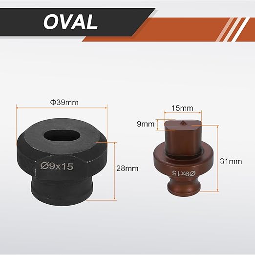 - Size - Hole Punch Die Shape: Oval; Upper hole dia: Φ9x15mm; Hardness: HRC56-58; Upper die height: 31mm; Lower die height: 28mm; Lower die diameter: 39mm.