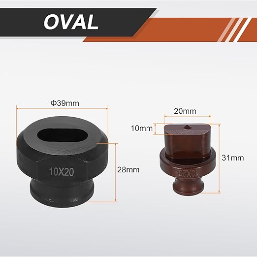 - Size - Hole Punch Die Shape: Oval; Upper hole dia: Φ10x20mm; Hardness: HRC56-58; Upper die height: 31mm; Lower die height: 28mm; Lower die diameter: 39mm.