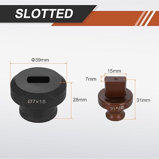 - Size - Hole Punch Die Shape: Slotted; Upper hole dia: Φ7x15mm; Hardness: HRC56-58; Upper die height: 31mm; Lower die height: 28mm; Lower die diameter: 39mm.