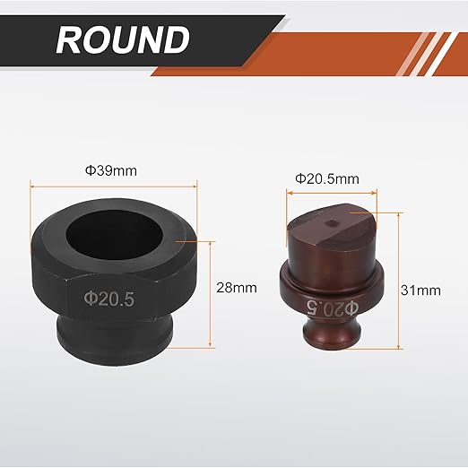 - Size - Hole Punch Die Shape: Round; Upper hole dia: Φ20.5mm; Hardness: HRC56-58; Upper die height: 31mm; Lower die height: 28mm; Lower die diameter: 39mm.