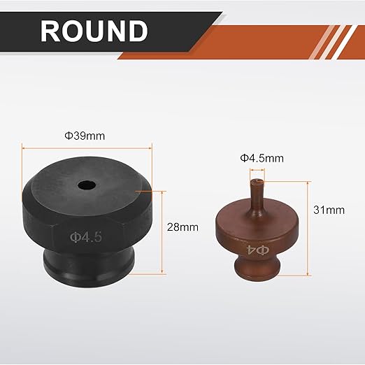 - Size - Hole Punch Die Shape: Round; Upper hole dia: Φ4.5mm; Hardness: HRC56-58; Upper die height: 31mm; Lower die height: 28mm; Lower die diameter: 39mm.