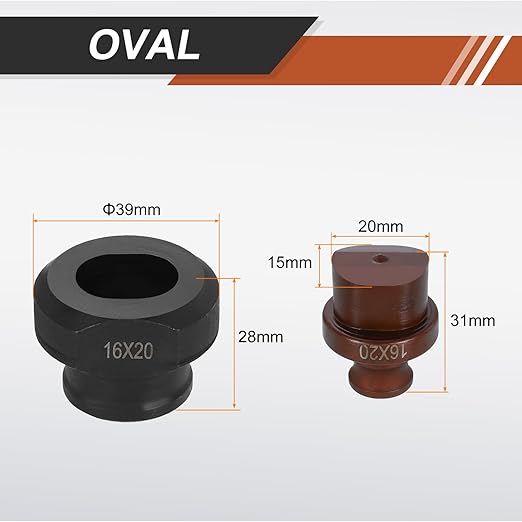 - Size - Hole Punch Die Shape: Oval; Upper hole dia: Φ16x20mm; Hardness: HRC56-58; Upper die height: 31mm; Lower die height: 28mm; Lower die diameter: 39mm.