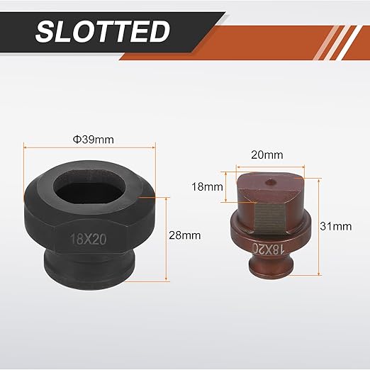 - Size - Hole Punch Die Shape: Slotted; Upper hole dia: Φ18x20mm; Hardness: HRC56-58; Upper die height: 31mm; Lower die height: 28mm; Lower die diameter: 39mm.