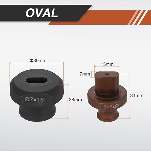 - Size - Hole Punch Die Shape: Oval; Upper hole dia: Φ7x15mm; Hardness: HRC56-58; Upper die height: 31mm; Lower die height: 28mm; Lower die diameter: 39mm.