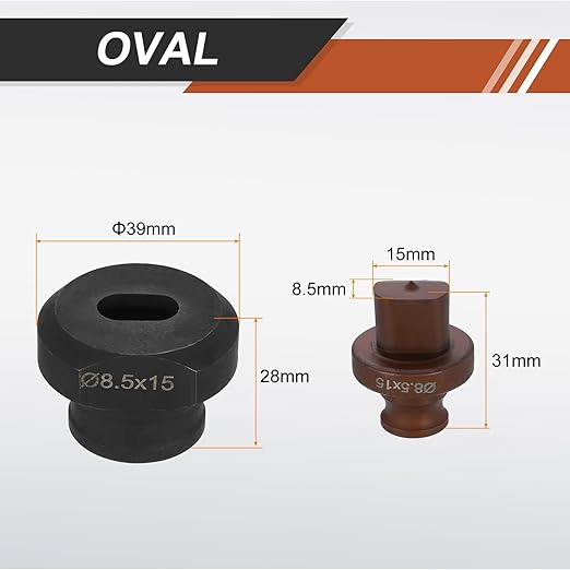 - Size - Hole Punch Die Shape: Oval; Upper hole dia: Φ8.5x15mm; Hardness: HRC56-58; Upper die height: 31mm; Lower die height: 28mm; Lower die diameter: 39mm.