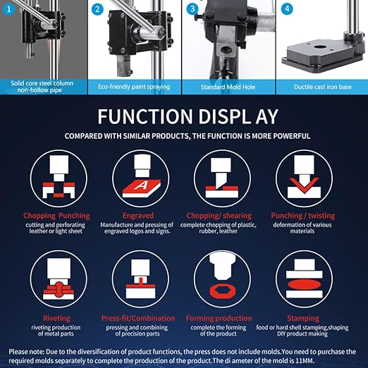 - We offer two different punching machines, round and square. The square punching machine adopts a widened rack to increase the strength and improve the downforce. The circular punching machine is equipped with a guide groove to increase the accuracy and improve the accuracy of repeated use, and it is not easy to deviate. Note: The stamping machine is made of cast iron, there will be slight paint peeling and rust, perfectionists please do not order.