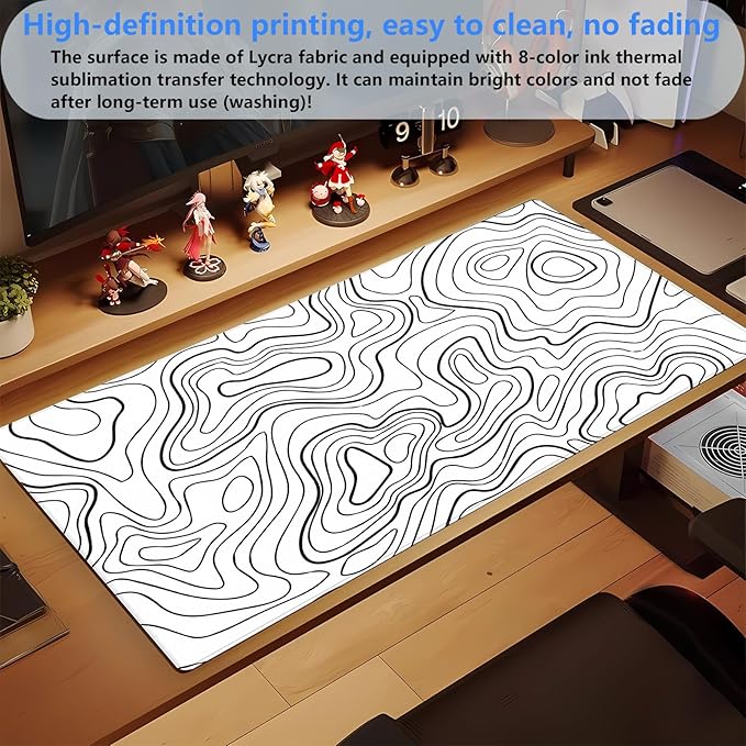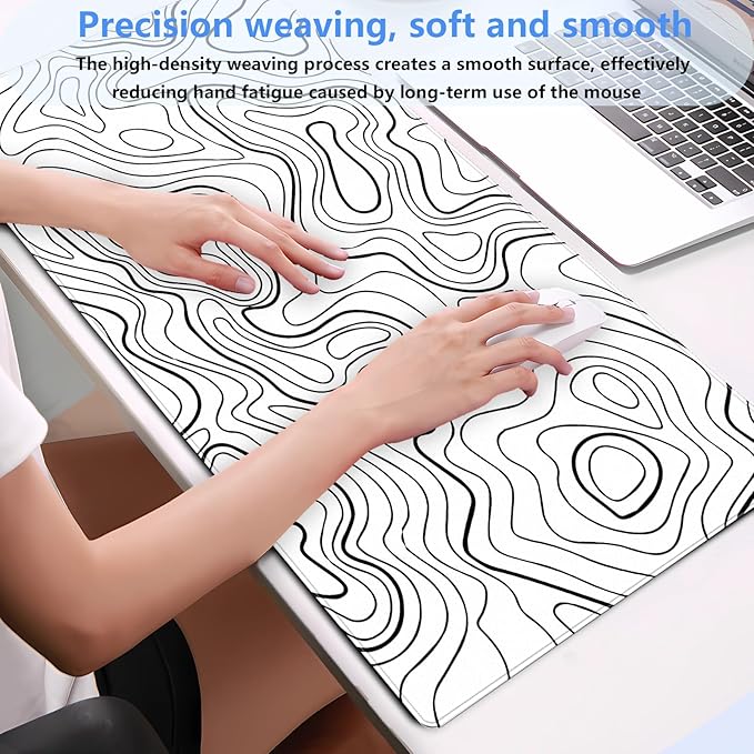 White Topographic Abstract Art Desk Mat - Large XL Gaming Mouse Pad with Stitched Edges, Full Desk Keyboard & Mouse Pad for PC, Laptop, Office Decor (31.5"x15.7")