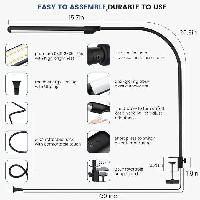- ADJUSTABLE DESIGN: 360° rotatable gooseneck and support rod with sturdy clamp-on mount, extending up to 26.9 inches in height for versatile positioning