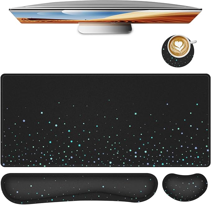 Desk Mat for Keyboard and Mouse,4in1 XXL Mousepad + Keyboard Wrist Rest+Mouse Wrist Rest+Coaster Set with Ergonomic Desk Pad for Home Office(Black Bluestar)