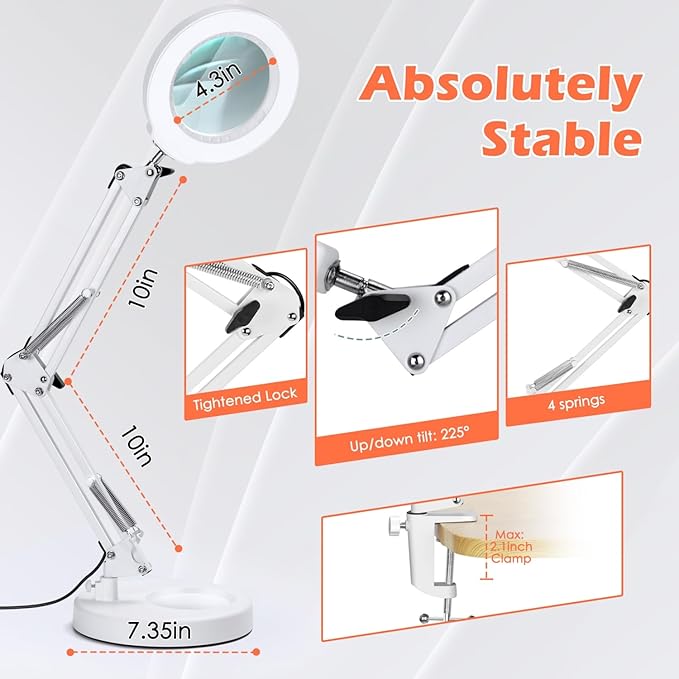 - 2 in 1 Design: This magnifying glasses with light for close work features a weighted base and a robust clamp (max 2.1 inches) that ensure stability on flat surfaces. The swing arm with four springs keeps the magnifying clamp light steady, allowing it to double as a desk lamp. It offers flexible positioning with an adjustable swing arm and a secure clamp, making it an excellent addition to any workbench or tabletop setup.