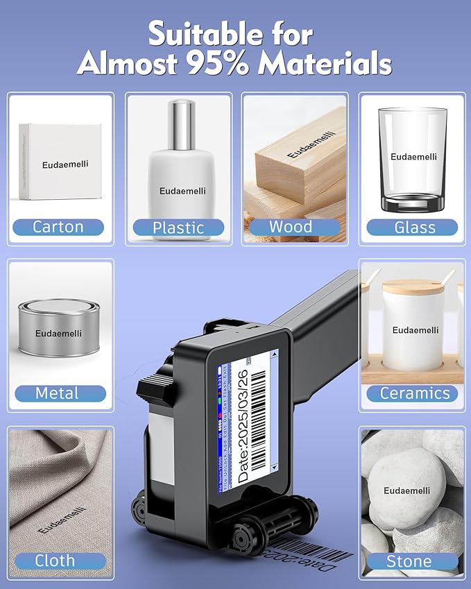 - Multi-Functional Mini Printer Gun: The Eudaemelli handheld inkjet printer features a positioning plate for printing on various surfaces, including metal, wood, glass, fabric, plastic, paper, ceramic, leather, stainless steel, and aluminum—even on 360° curved surfaces. (Note: The positioning plate is required for printing on curved surfaces.)