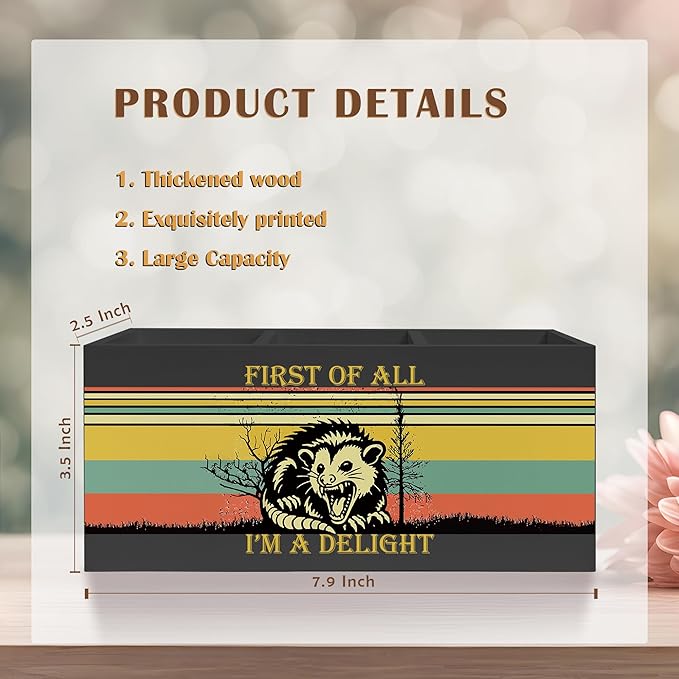 Sarcastic Angry Opossum Pencil Pen Holder for Desk, First of All I'm A Delight Wooden Pencil Holder Organizer for Home Office Desk Accessories, Funny Office Gifts for Women Men