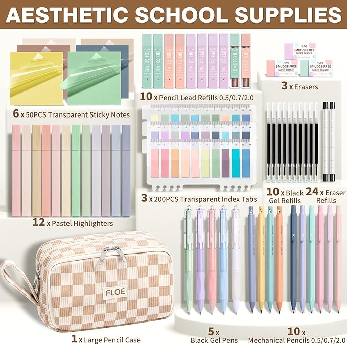- AESTHETIC SCHOOL SUPPLIES: The back to school supplies includes 1 cute pencil case pouch, 12 pastel highlighters, 5 black gel pens with 10 gel refills, 10 mechanical pencils 0.5, 0.7, 2.0mm with 392pcs lead refills, 3 erasers, 24pcs eraser refills, 600pcs transparent sticky index tabs, and 300pcs transparent sticky notes. This all-in-one cute stationery set is the ultimate combination of college school supplies, nursing school supplies, office supplies, bible study supplies & journaling supplies