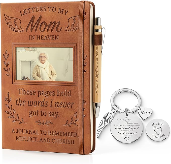 Memorial Gifts for Loss of Mom, Letters to My Mother in Heaven Grief Journal with Photo Frame, Wood Pen & Angel Keychain, Bereavement Memorial Gift