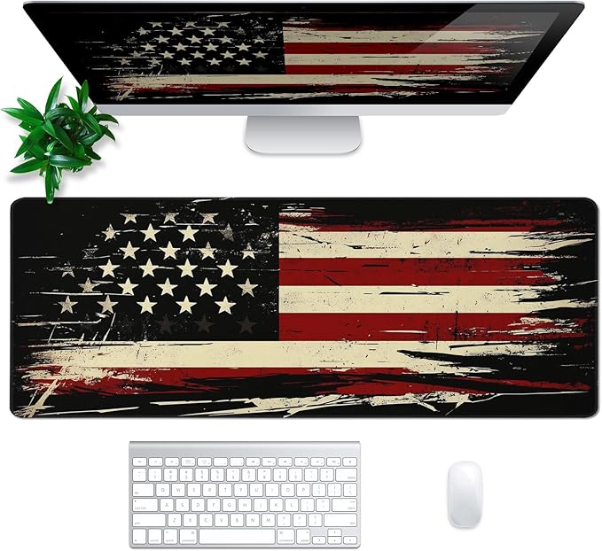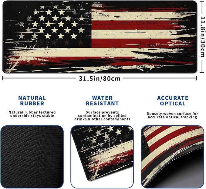 - ♥[Large and Perfect Size]:The extended American Antique Flag desk pad measures 31.5x11.8x0.12 inches that covers most of the desk.The desk pad is large enough to have a mouse, gaming keyboard, and other desk items while maintaining protecting your desk all the time.You can freely move your mouse without any interruption and don't have to continually adjust the mat as you do with traditional mousepads.