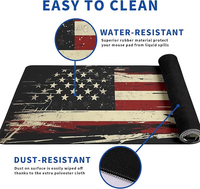 - ♥[Easy To Clean]:This large American Antique Flag mouse pad for desk, Spill-proof coating protects your desktop from spilled water, Drinks, Ink and the other liquid spilled liquid or other accidents.Easy to clean, Just wipe with a wet cloth or paper, Does not fade and can be washed and foldable without leaving creases, Easy to carry.