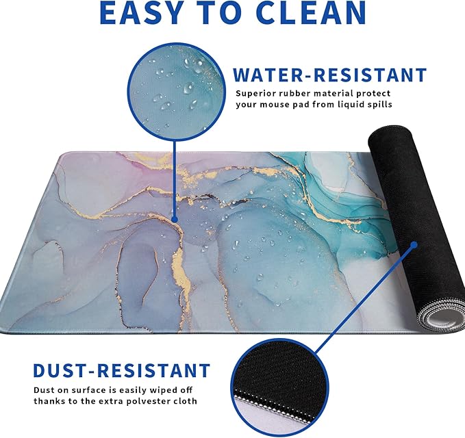 - ♥[Easy To Clean]:This large Teal Marble mouse pad for desk, Spill-proof coating protects your desktop from spilled water, Drinks, Ink and the other liquid spilled liquid or other accidents. Easy to clean, Just wipe with a wet cloth or paper, Does not fade and can be washed and foldable without leaving creases, Easy to carry.