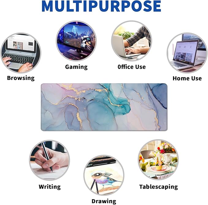 - ♥[Large and Perfect Size]:The extended Teal Marble desk pad measures 31.5x11.8x0.12 inches that covers most of the desk.The desk pad is large enough to have a mouse, gaming keyboard, and other desk items while maintaining protecting your desk all the time.You can freely move your mouse without any interruption and don't have to continually adjust the mat as you do with traditional mousepads.