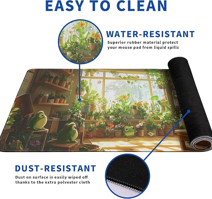 - ♥[Easy To Clean]:This large Cute Frogs Green mouse pad for desk, Spill-proof coating protects your desktop from spilled water, Drinks, Ink and the other liquid spilled liquid or other accidents. Easy to clean, Just wipe with a wet cloth or paper, Does not fade and can be washed and foldable without leaving creases, Easy to carry.