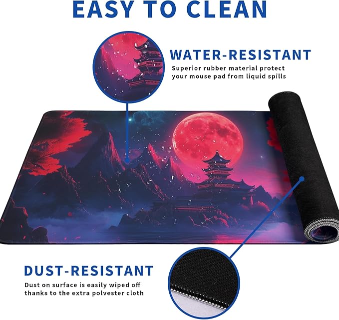 - ♥[Easy To Clean]:This large Darkness Red Moon mouse pad for desk, Spill-proof coating protects your desktop from spilled water, Drinks, Ink and the other liquid spilled liquid or other accidents. Easy to clean, Just wipe with a wet cloth or paper, Does not fade and can be washed and foldable without leaving creases, Easy to carry.
