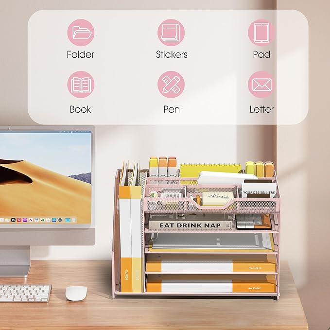 5 Tier Paper Letter Tray with File Holder and 3 Drop-in Pen Holders, Mesh Desk File Organizer with Handle, Desk Organizers and Accessories for School,Home, Office Supplies Storage-Pink