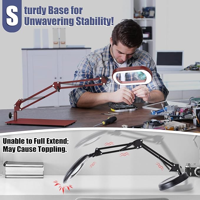 - Heavy Base For Stable: Our magnifying light features a sturdy rectangular large base, ensuring it remains firmly planted without any risk of sliding. With its flexible swing arms, adjusting the angle to perfection is a breeze. Easily position the lamp without any bouncing back, allowing you to stay fully focused on intricate tasks, hobbies, miniatures painting, sewing...