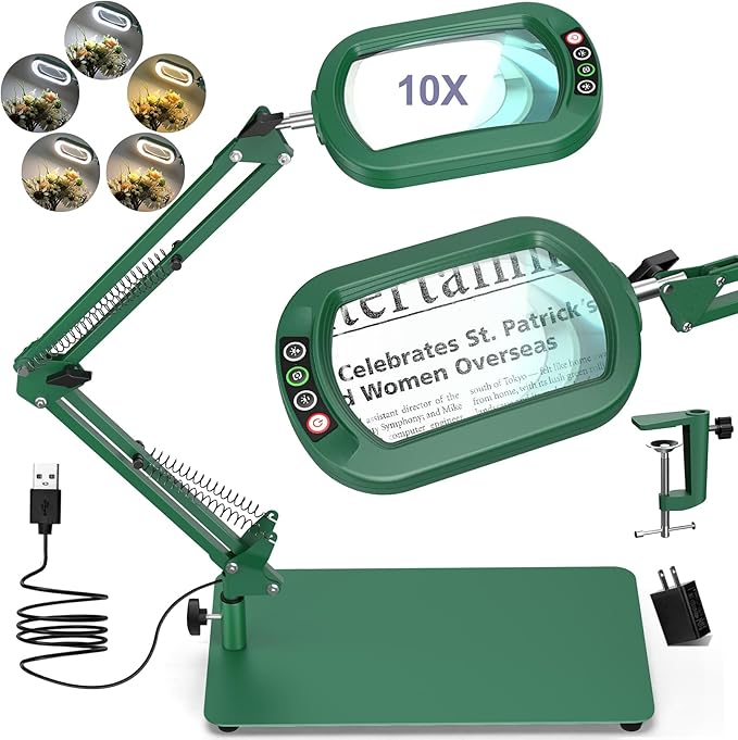 - Package includes: 1* Weighted Base; 1* Clamp; 1* Real Glass Lens; 1* Swing Arms. Powered by USB for convenience, our product is easy to mount and perfect for a wide range of enthusiasts, including estheticians, jewelers, artists, architects, painters, seniors with macular degeneration, hobbyists, and crafters who demand precision in their work.