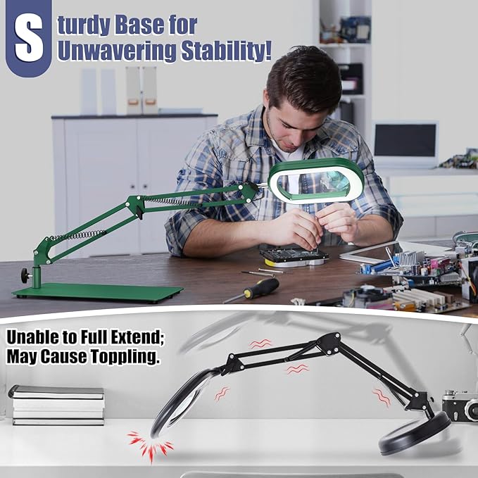 - Heavy Base For Stable: Our magnifying light features a sturdy rectangular large base, ensuring it remains firmly planted without any risk of sliding. With its flexible swing arms, adjusting the angle to perfection is a breeze. Easily position the lamp without any bouncing back, allowing you to stay fully focused on intricate tasks, hobbies, miniatures painting, sewing...