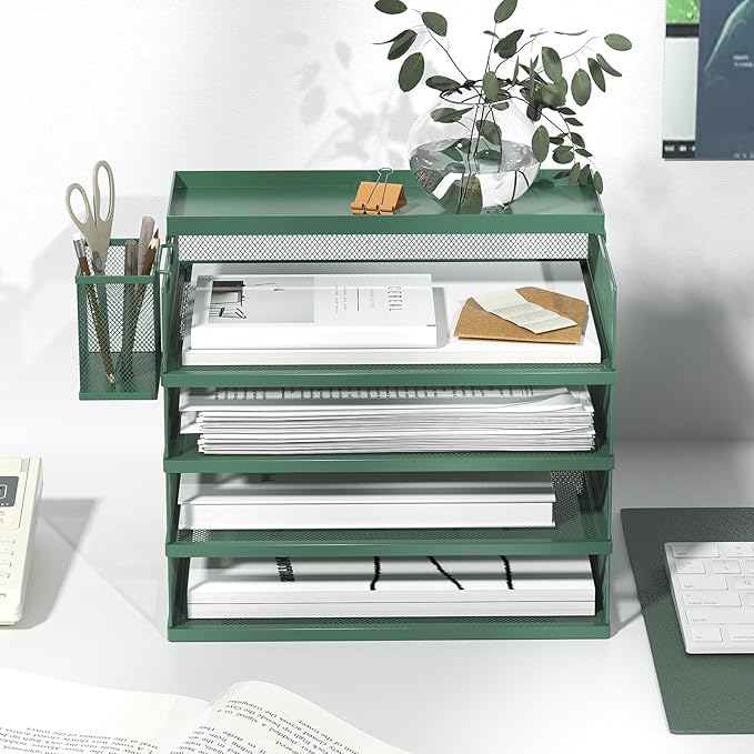 Metal Stackable Letter Trays, 4-Tier Desk Organizer & Paper Trays for Office, Stackable File & Document Tray with Magnetic Labels,Green