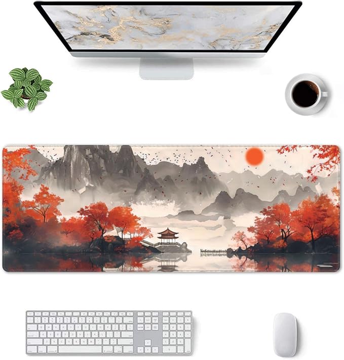 Autumn Landscape Ink Painting Large Mouse Pad, Japanese Anime Gaming Desk Mat, XL Keyboard Desk Pad Mat for Desktop, 31.5"x11.8" Non-Slip Base Big Mousepad with Stitched Edges