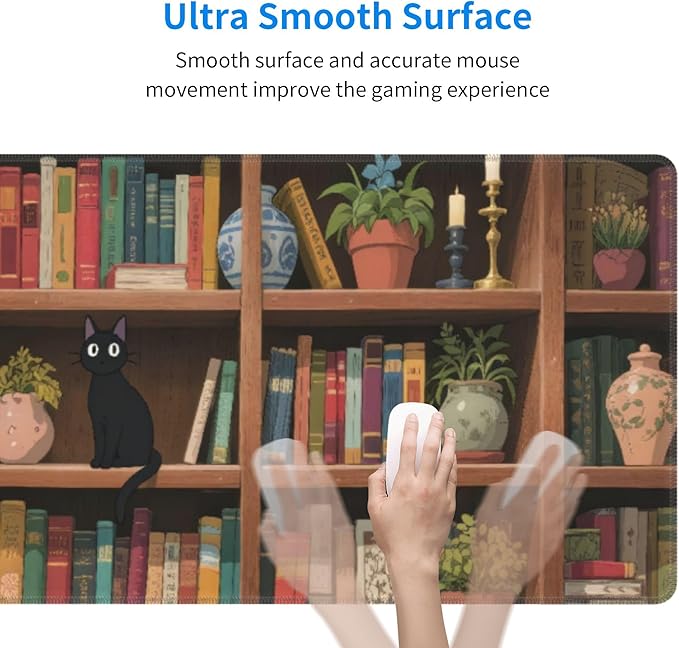 Bookshelf Cat Green Plants Large Mouse Pad, Anime Style Gaming Desk Mat, XL Keyboard Desk Pad Mat for Desktop, 31.5"x11.8" Non-Slip Base Big Mousepad with Stitched Edges