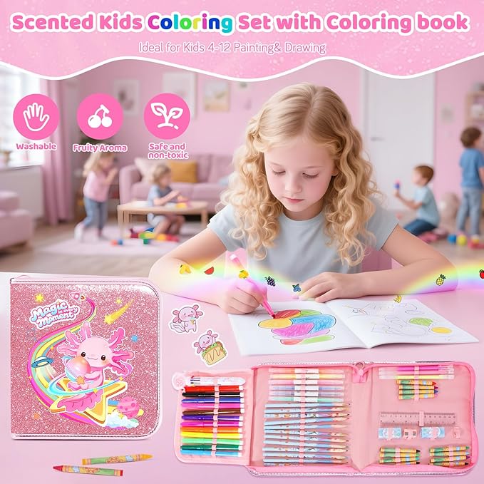 72PCS Fruit Scented Markers Set - Art Coloring Drawing Kits for Kids with Axolotl Pencil Case, Art Supplies for Kids Ages 4 6 8,Stationary Set Pencil,Crayon&Markers Stuff,Birthday Gifts Toys for Girls