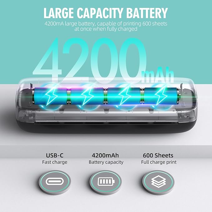 - Bluetooth printer-Clear Printing and Large Battery: The printer is designed with high-definition printing technology, providing you with clear printing, and a 4200mAh battery design, which can support printing of up to 600 sheets of paper.